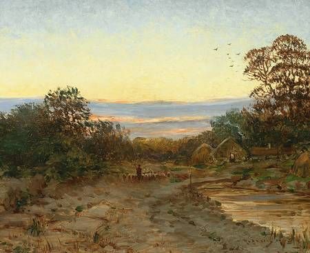 Abendlandschaft mit heimkehrendem Schäfer und Gehöft.