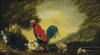 | A cockerel, hens, chicks and a mallard in a wooded landscape, a castle beyond | |