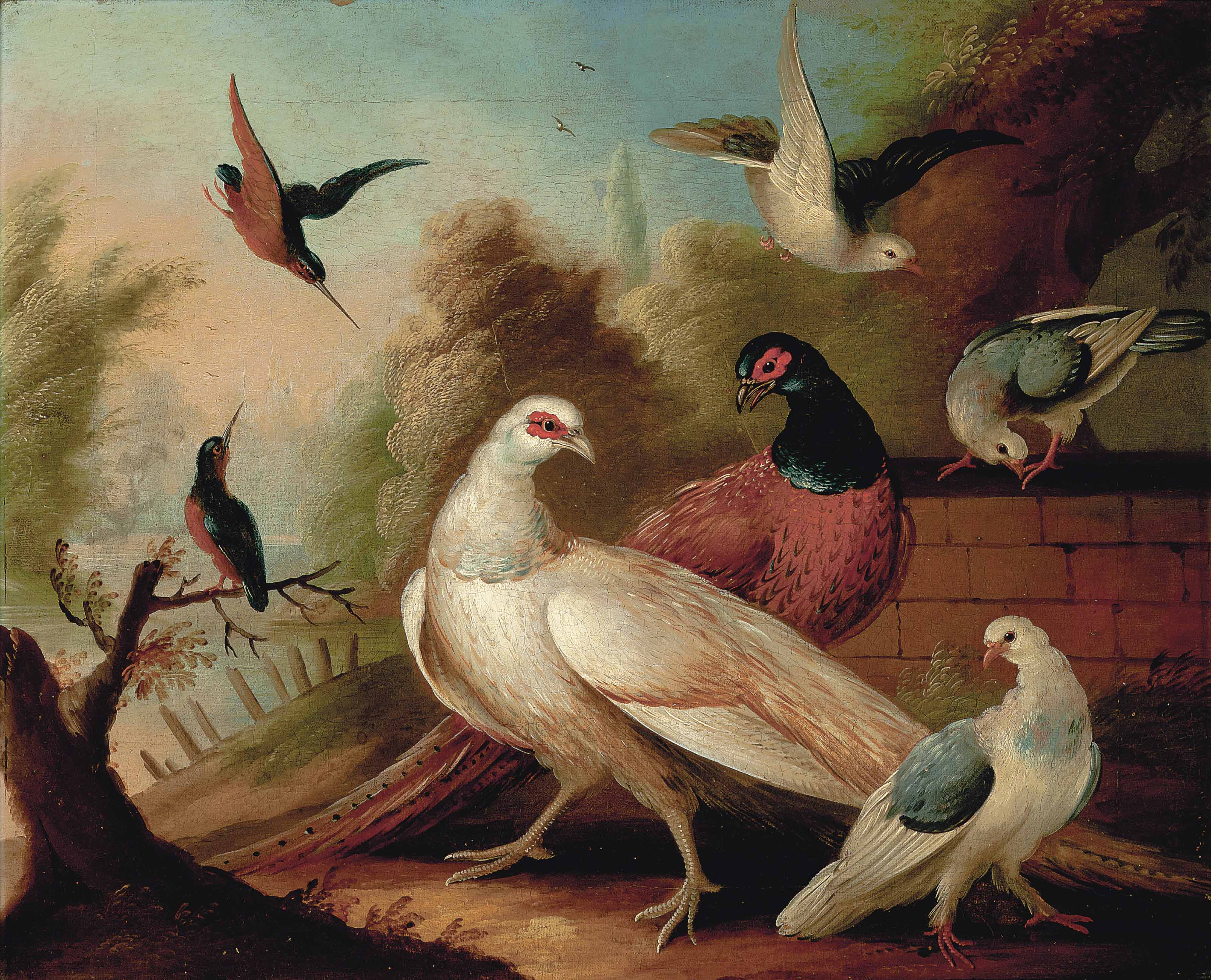 | Pheasants, a pigeon and other birds, a pond beyond | |