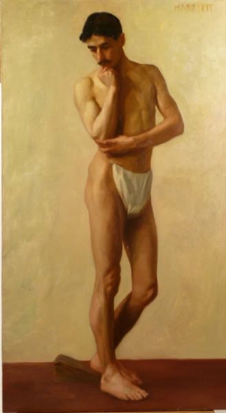 A PORTRAIT OF A GENTLEMAN WEARING UNDERWEAR, FULL LENGTH
