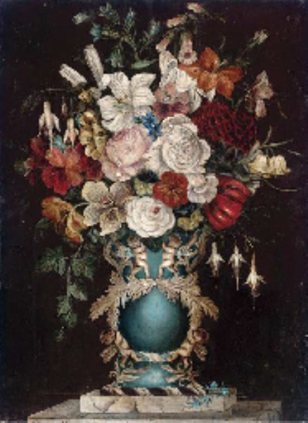| Summer flowers in an ornate vase decorated with cherubs | |