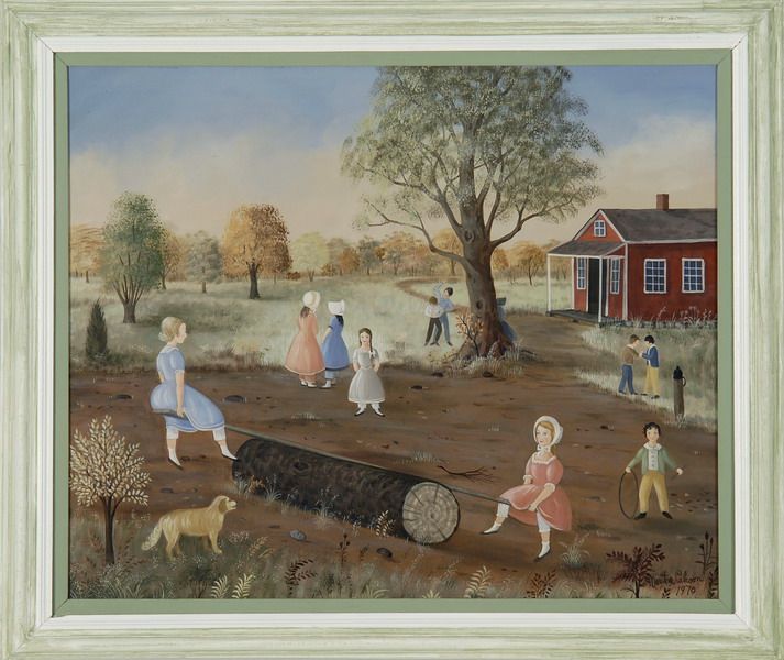 | 19th century schoolyard scene with girls on a seesaw made from a log, boy with a hoop, a bully, a dog, and other children. | |