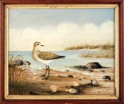 SHORE SCENE WITH SANDPIPER AND SHELLS.