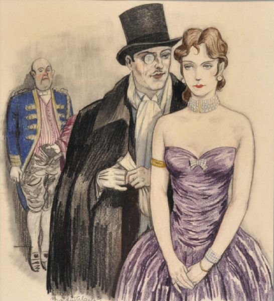 Elegantes Paar, ein livrierter Diener steht im Hintergrund