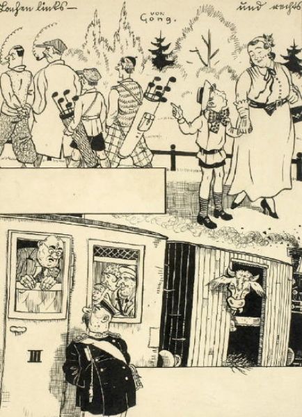 Golfspieler unterwegs zum Golfplatz und Zug mit Passagieren und Kuh