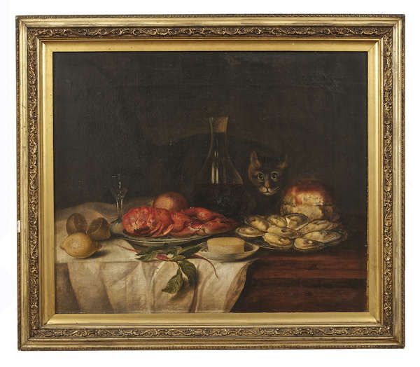 | A Still Life of Shellfish, a Carafe of Wine, Lemons, Bread and Cheese with a Cat on a Tabletop | |