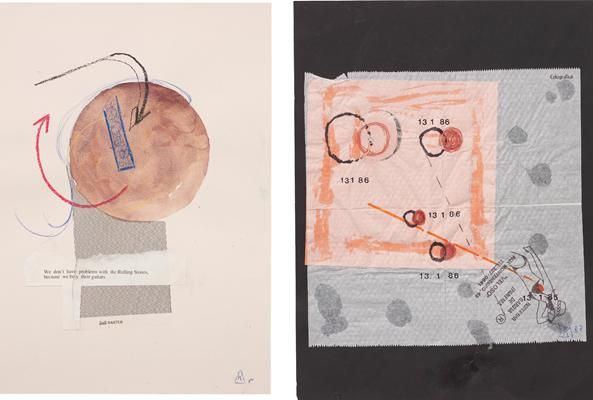 | Pencil pen, wax and crayon on paper and napkin collage | |