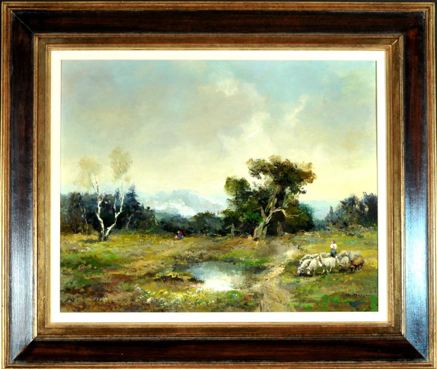 Hirte mit Schafen in Moorlandschaft im bayrischen Voralpenland