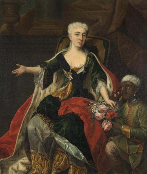 | A portrait of a noblewoman, full length, seated, with a blackamoor kneeling beside her holding a basket of flowers, thought to b | |