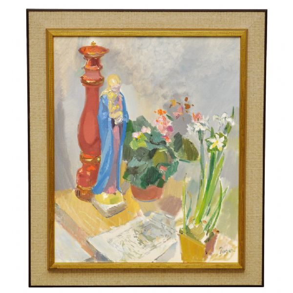 Stilleben med krukväxter och skulptur av Maria och barnet