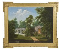 A classical villa in a wooded landscape with a gothic out-house