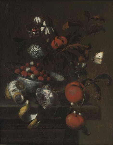 | A delft blue and white bowl with cherries, clementines, a rose, mixed flowers in a glass vase and a partly-peeled lemon on a sto | |