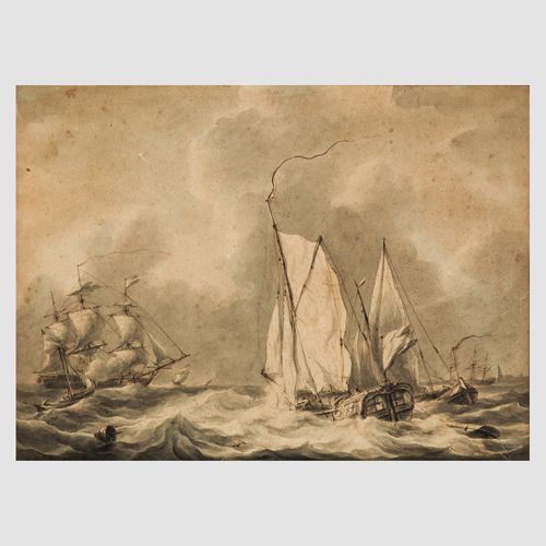 | A YACHT IN A HEAVY SWELL WITH A MAN O' WAR AND FISHING BOATS OFF THE COAST OF DORDRECHT | |