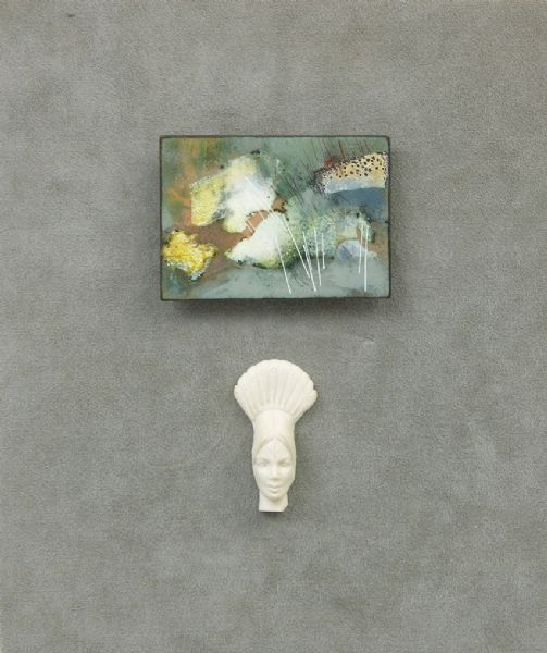 | Enamel on copper and mixed media' grey suede-cloth over homasote board, overall | |