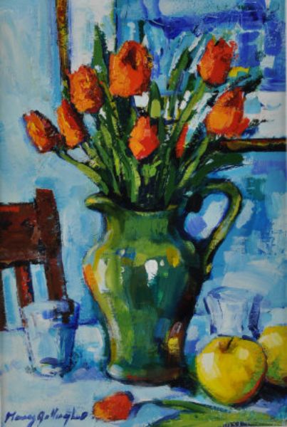 Still Life of Tulips in a Green Jug with Apples