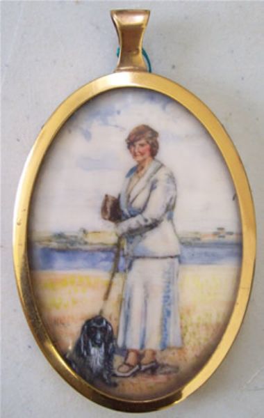 | An oval portrait miniature of a lady, shown standing in a cream suit, with black spaniel on a lead | |