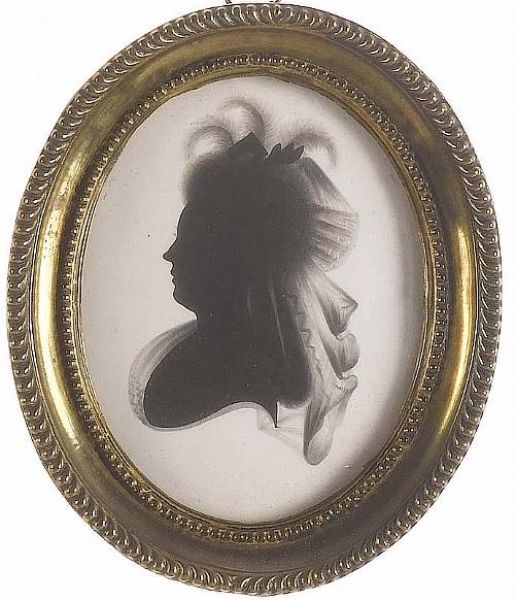 | Two silhouettes of Ladies, both profile to the left, wearing dresses, fichus, their hair adorned with gauze veils, ribbons and f | |