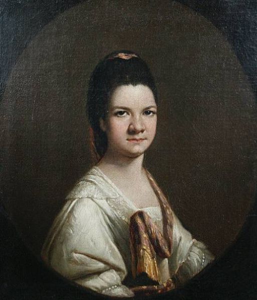 | A bust portait of a woman with dark hair wearing a white dress, in a painted oval | |