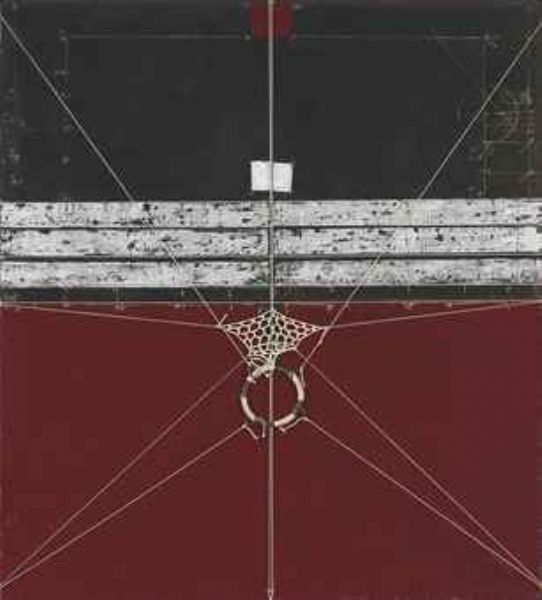 | Oil metallic paint, silver leaf, metal rings and string on canvas | |