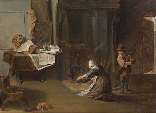 | A maid stoking a fire with a boy holding firewood, in an interior with a table laden with sculpture and manuscripts | |