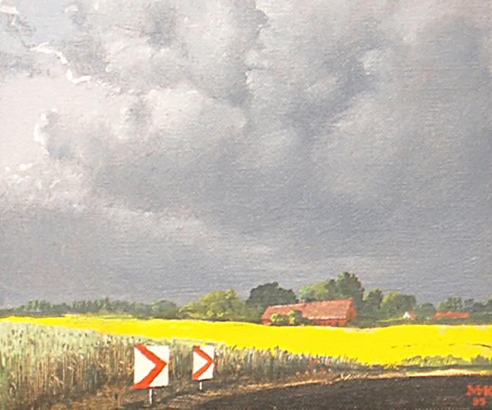 Landstraße vor Kornfeld, im Hintergrund Gehöft bei aufziehendem Gewitter