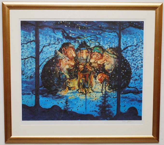 Motiv av en samling troll ihopkurade runt en brasa i vintertid