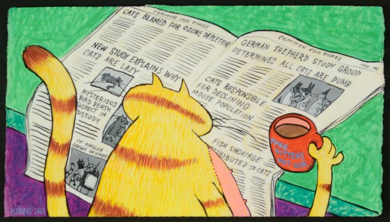 a cat reading the newspaper.