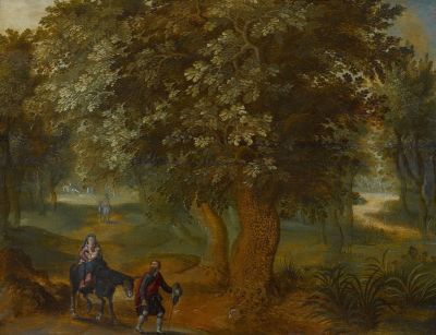 Waldlandschaft mit Hl. Familie auf der Flucht nach Ägypten.