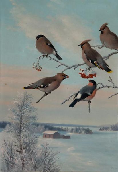Tilhiä ja punatulkkuja pihlajan oksalla