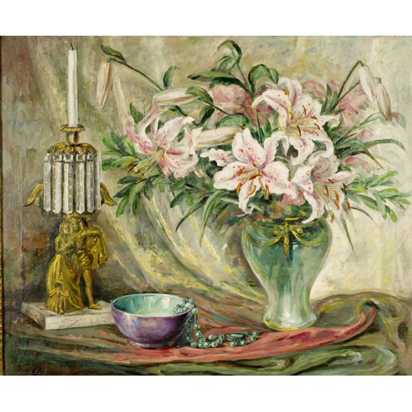 floral still life w/ stargazer lilies & figural lustre candlestick