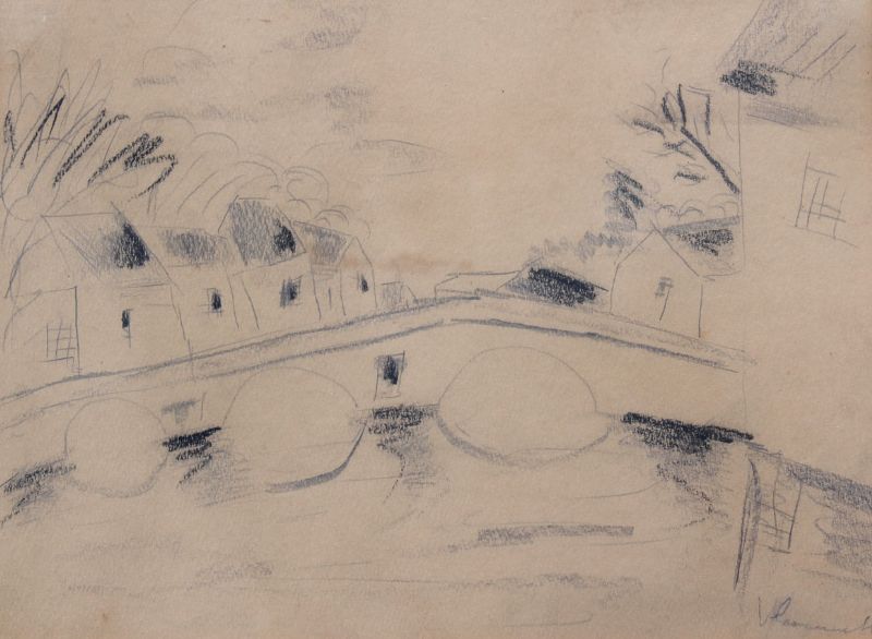 French Village with Bridge over a Canal, Sketch