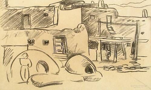 Taos Pueblo Adobes; Indian Woman Holding a Basket