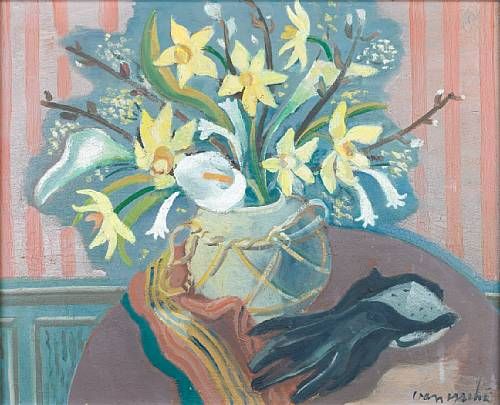 | Still life with daffodils, arum lilies and a pair of gloves | |