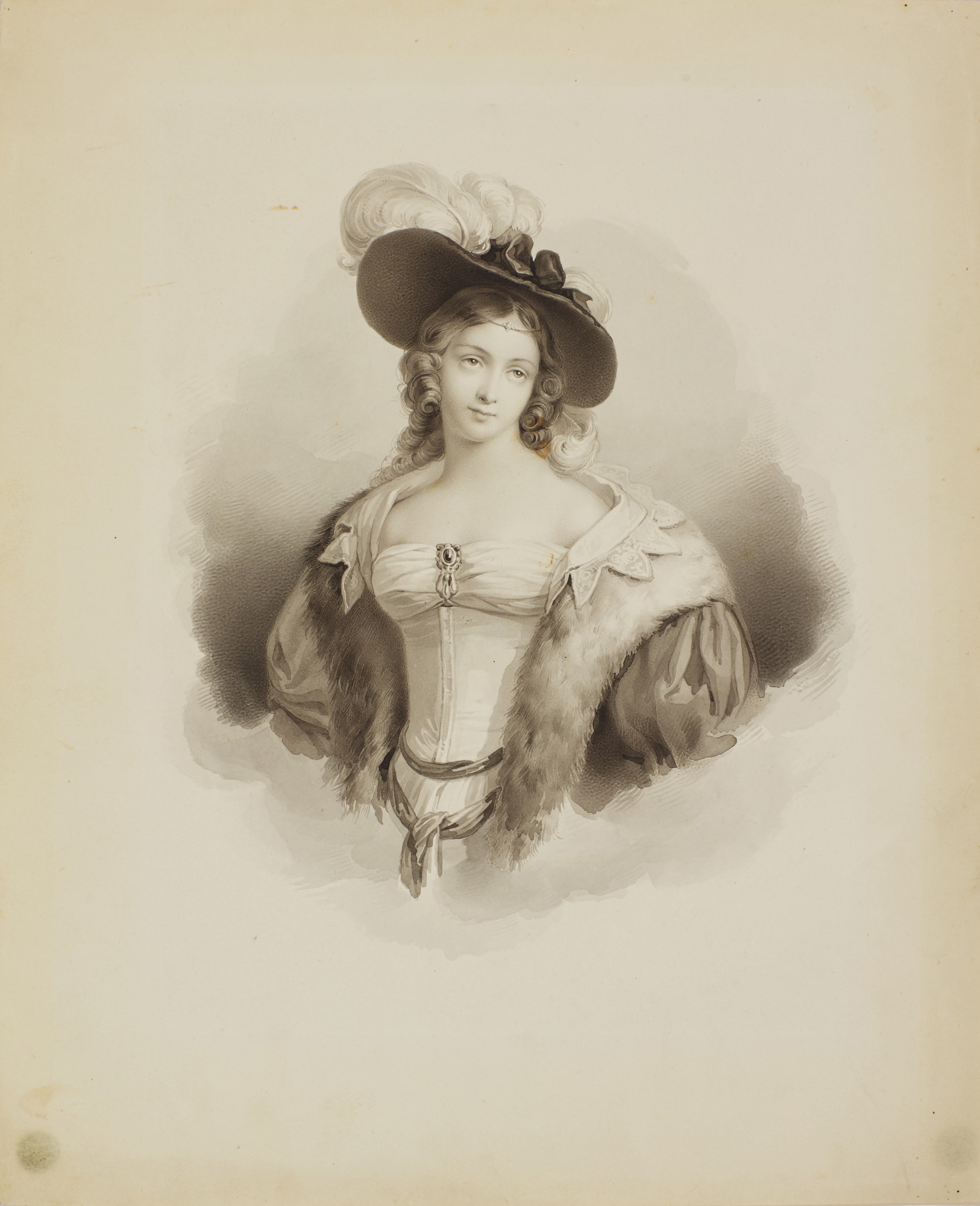 | Portrait of a young woman in elegant attire with a fur lined coat and a feather in her hat | |