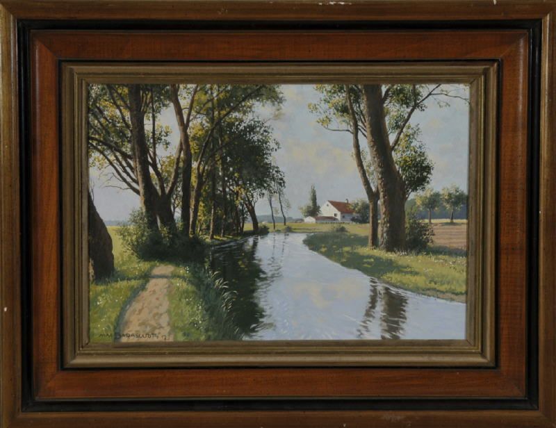 Sommerlicher Bachlauf mit Bäumen gesäumt und Blick auf ein Gehöft in der Ferne