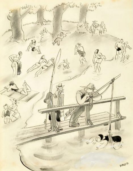 Zwei Angler, einer hat eine Schwimmerin an der Angel