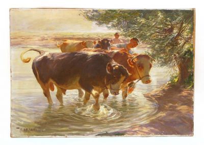 Bauer mit Kühen bei Flussüberquerung