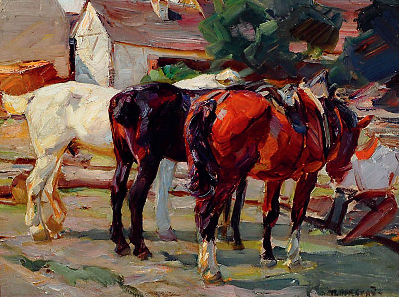 | Haimhausen, Studium an den Akademien Berlin und München, Meisterschüler von H. v. Zügel, hier: Pferde vor dem Stall | |