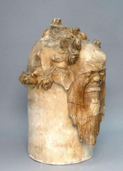 Haut de colonne à décor d'un grotesque et d'une couronne de roses