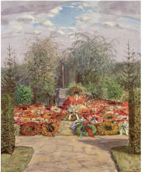 Gedenkkreuz in Parkanlage, davor zahlreiche Blumenkränze. Sommertag.