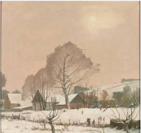 Winterliche Dorflandschaft mit Hügelhintergrund.