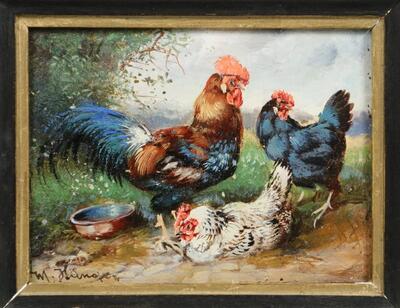 'Barnyard Poultry', oil on panel, signed lower left, in black and gold wood frame, OS: 5" x 6", SS: 3 1/2" x 4 1/2", fine condition. | |
