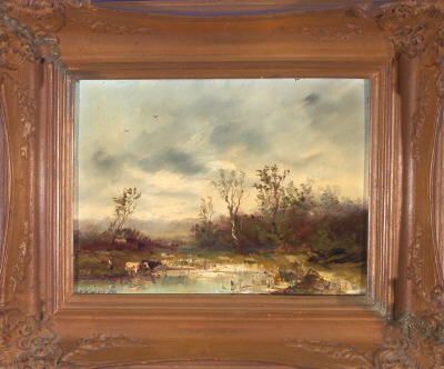 Bäuerin mit zwei Kühen an der Tränke in bewaldeter Landschaft bei Gewitterstimmung