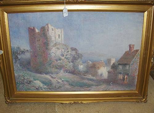 Drover beside a village pub by a ruined tower