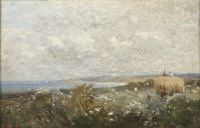 Figures gathering hay in a coastal landscape