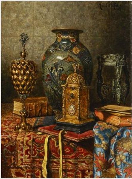 | STILL LIFE WITH CLOISONNE VASE, CLOCK AND POKAL; STILL LIFE WITH SATSUMA AND CLOISONNE VASES | |