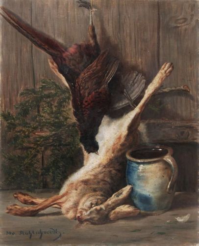 Jagdstilleben mit erlegtem Hasen und Fasan.