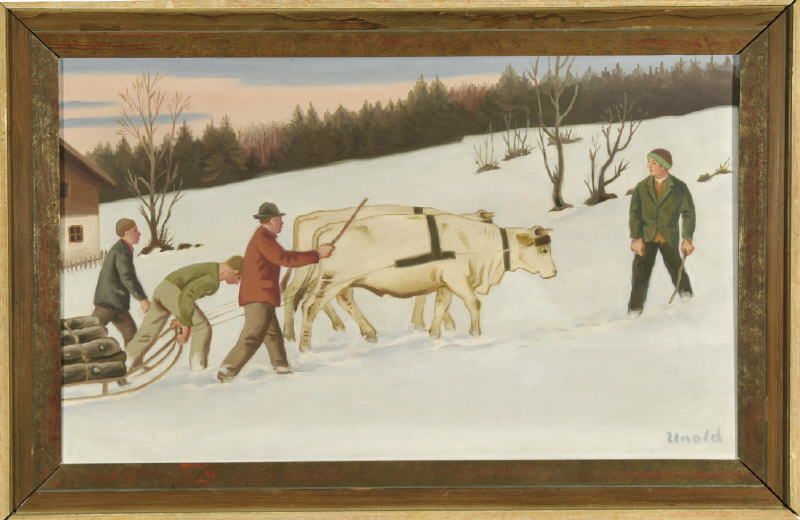 | Vier Männer treiben ein Ochsengespann mit Holzschlitten eine winterliche Anhöhe hinauf | |