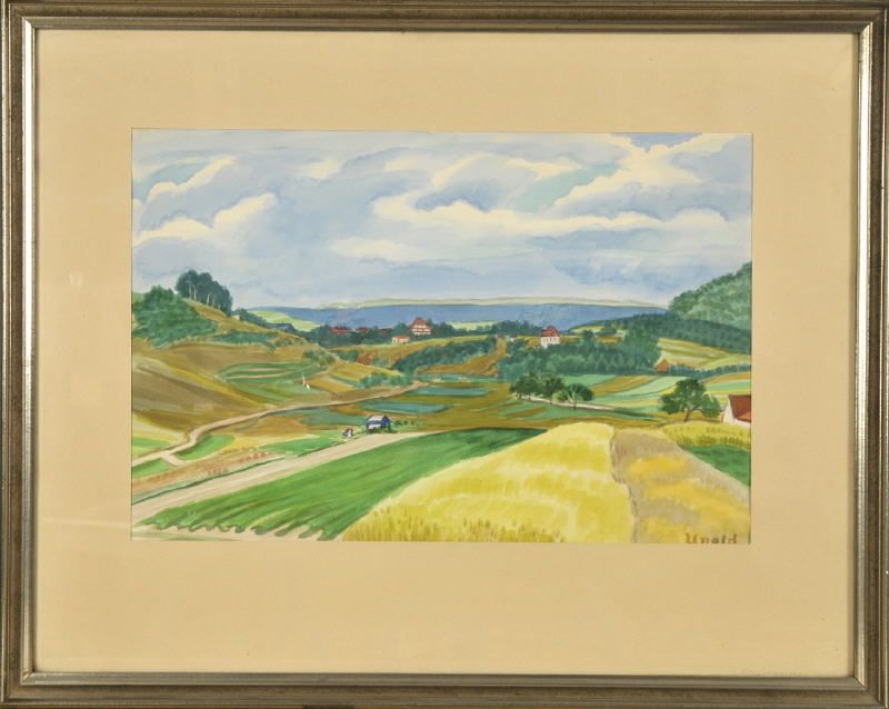 | Weite Feldlandschaft mit einer Straße, welche die Häuser in der Ferne verbindet | |