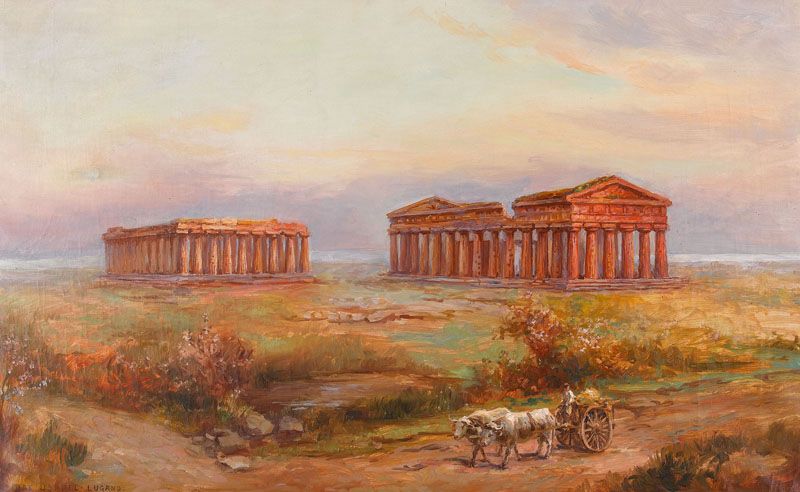 Die griechischen Tempel von Paestum im Abendrot.